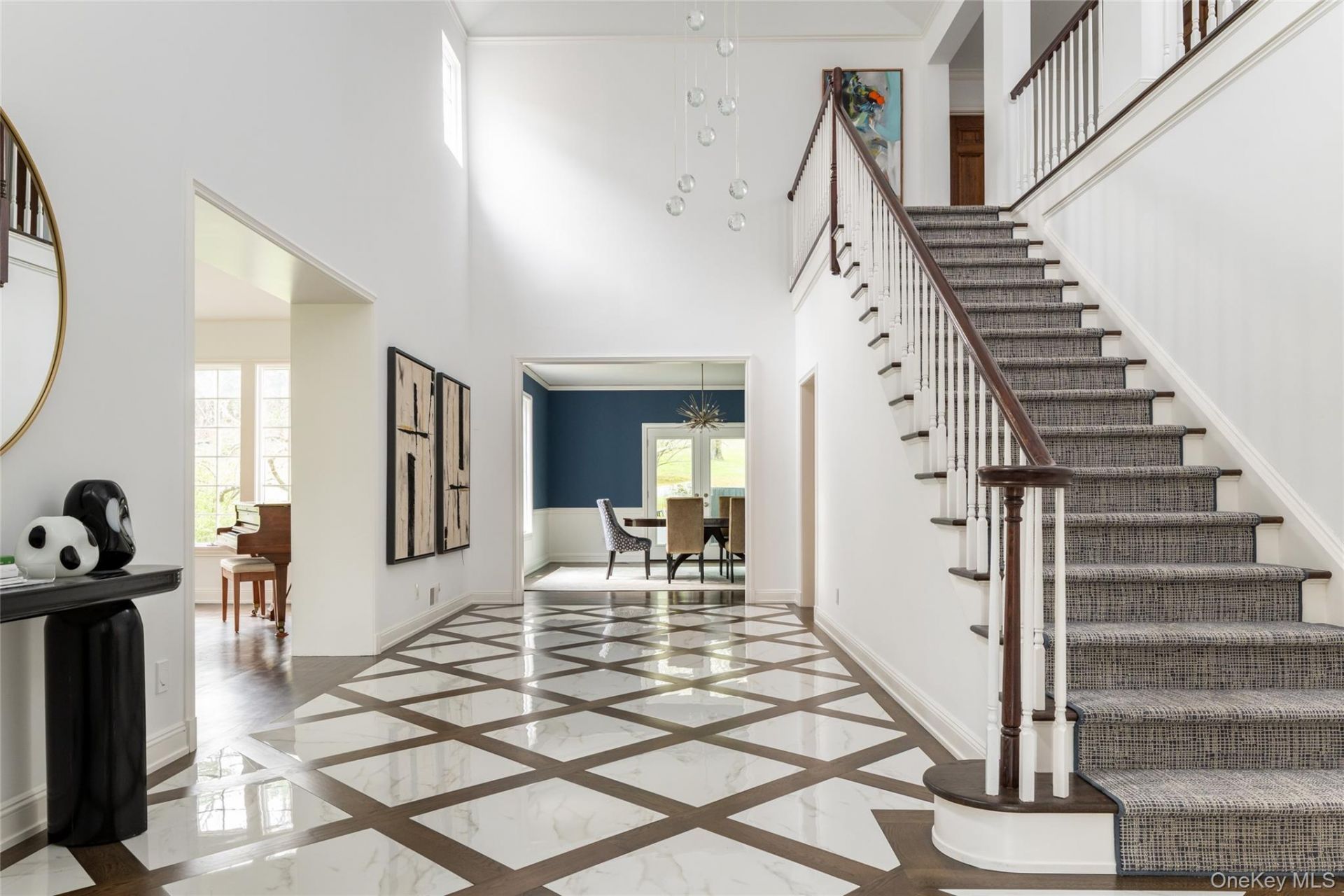 Set at the end of a quiet cul-de-sac within the prestigious gated community of Lincoln Rise, this home offers exceptional curb appeal with a circular driveway on 1.16 private, park-like acres. A brand-new custom marble entry with soaring ceilings welcomes you, complemented by a newly updated powder room. The formal living room features cathedral ceilings, a wood-burning fireplace, and abundant natural light, while the formal dining room offers new French doors to the patio. The updated kitchen was renovated in 2021 showcases quartz countertops, stainless steel appliances, a custom bar with wine fridge, and opens to the breakfast room and sun-filled family room with a double-sided fireplace. A first-floor office/bedroom with full bath adds flexibility. Upstairs, the primary suite features a fireplace with marble surround, updated bath, walk-in closets, and private office/sitting room. A guest ensuite and two additional bedrooms with Jack-and-Jill bath complete the second level. The lower is finished storage- it is an additional 1800 square feet - including a playroom, gym, laundry, and storage. Enjoy complete privacy outdoors with a slate patio, new retractable awning, updated landscaping, and drainage. Freshly painted with new lighting throughout-turnkey and pristine.